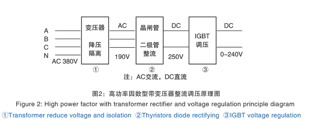 1. Klassificerad genom likriktande spänningsreglering: Tyristorer (SCR) kan användas för att slutföra samtidig likriktning och spänningsreglering, eller använd först diod eller tyristor som likriktar och använd sedan IGBT-regleringsspänning. Använd IGBT reglera spänningen är för att förbättra utrustning faktor.kan spara el och ytterligare förbättra svetskvalitet.